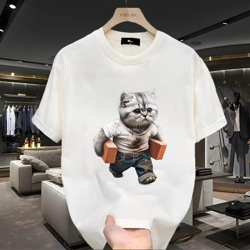 เสื้อลายแมว เสื้อเชิ้ตแขนสั้น ลาย ฮิตมากในยุคนี้ แฟชั่นฤดูร้อน, คอกลม, แขนสั้นลำลอง